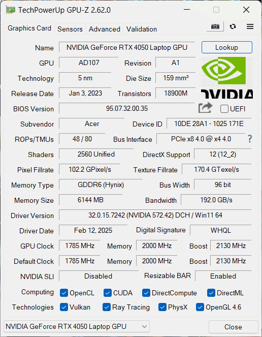 Ekran kartı olarak benim cihazımın içinde RTX 4050 6 GB VRAM 75W var. Öncelikle ben bu laptopu aldığım zaman 75W konusunda oldukça korkmuştum, çünkü çoğu kişi abartarak öbür 30 serisi daha yüksek W değerine sahip kartların tercih edilmesi gerektiğini söylemişti. Fakat YouTube üzerinden de testlere bakarsanız 95W veya 140W 4050 kartlarına göre 75W 4050'nin yaklaşık 5-6 FPS oynadığını göreceksiniz, ayrıca kartın içindeki FG özelliği bile kartı 30 serisine göre öne geçiren konulardan. İşlemcinin kendi ekran kartına deyinmeyeceğim, çünkü sadece masaüstünde kullanılıyor. Oyun oynayacağınız zaman vs. NVIDIA karta geçiyor.