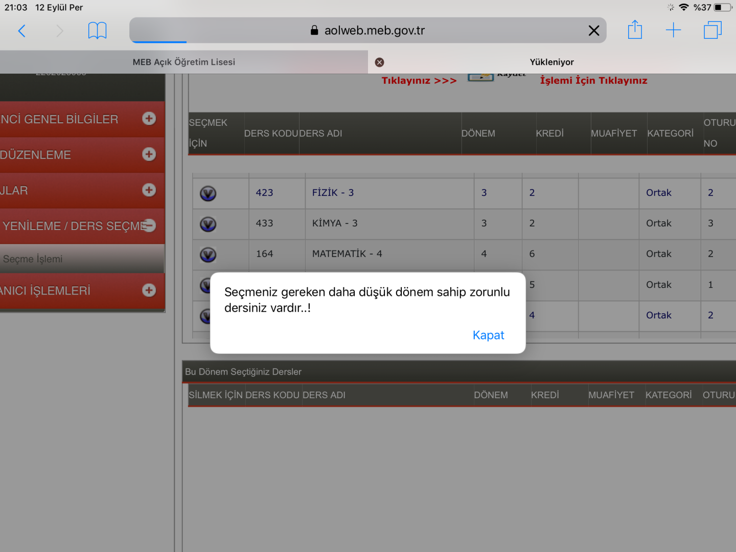 4.döneme kayıt yeniledik bugün ve şimdi aralıktaki sınav için ders seçmeye çalıştım ama hata verdi hata ektedir;