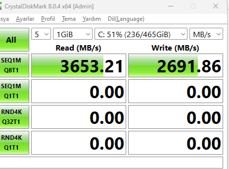 SSD: Adata Legend 750 kartta 3500/sn okuma 3000/sn yazma yazıyor.