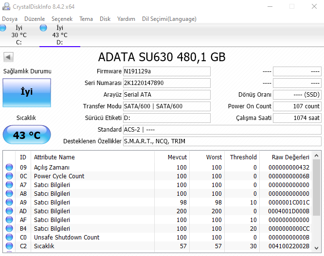 Diğeri ise 29 Haziran'da elime geçen toplu sistem ile aldığım Adata SU 630 480 GB SSD.