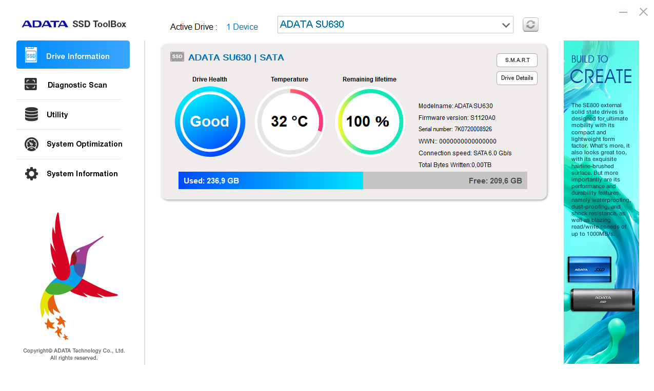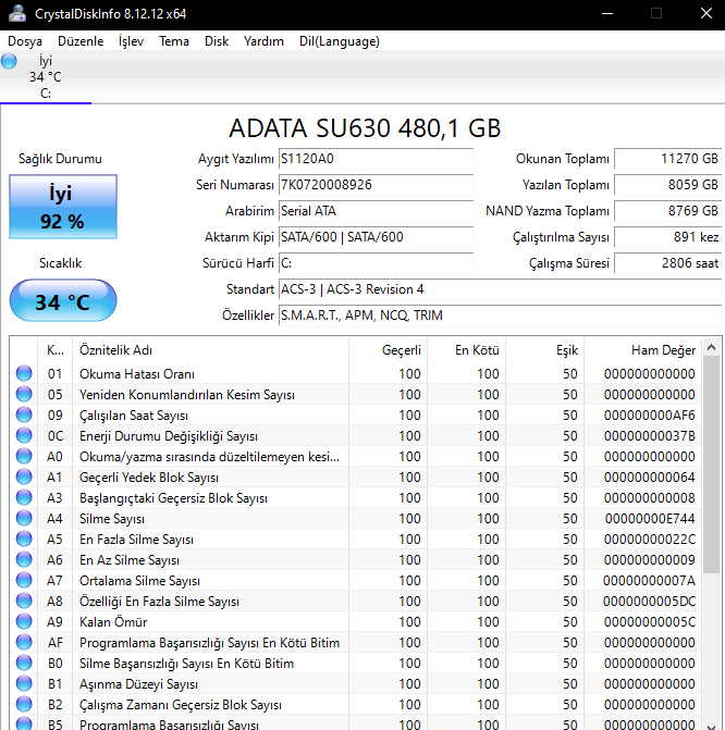 NOT: Adata SSD Toolbox'dan baktığımda, sağlık iyi, kalan ömür yani sağlığı %100 olarak görünüyor)