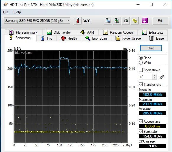 Benim de Samsung 860 EVO geldi arkadaşlar. Hiçbir kurulum yapmadan direkt olarak çalıştırdım HD Tune Pro yazılımını. ADATA'daki droplar yok, stabil şekilde okuyor. Bu da sistemde takılma yaşatmayacağı anlamına geliyor. Ek olarak tepki süresi de oldukça iyiymiş. SATA3 sistemde de test edip paylaşacağım çok yakında.