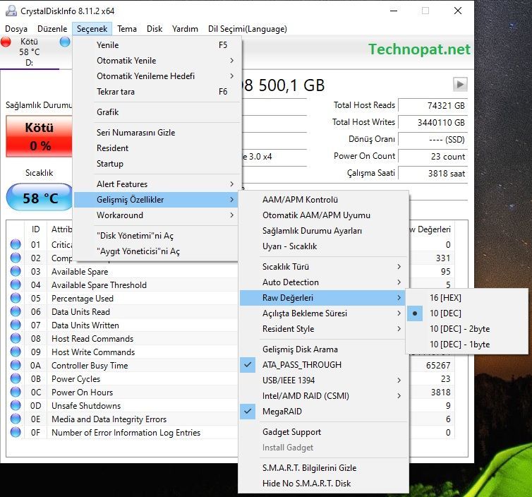 SMART değerlerini ondalıklı yapın ve tekrar SS atın.