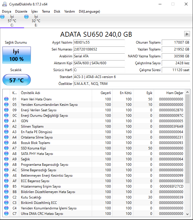 Adata SU650 240,0 GB SSD sahibiyim ciddi performans sorunları yaşıyorum. Değerler normal mi?