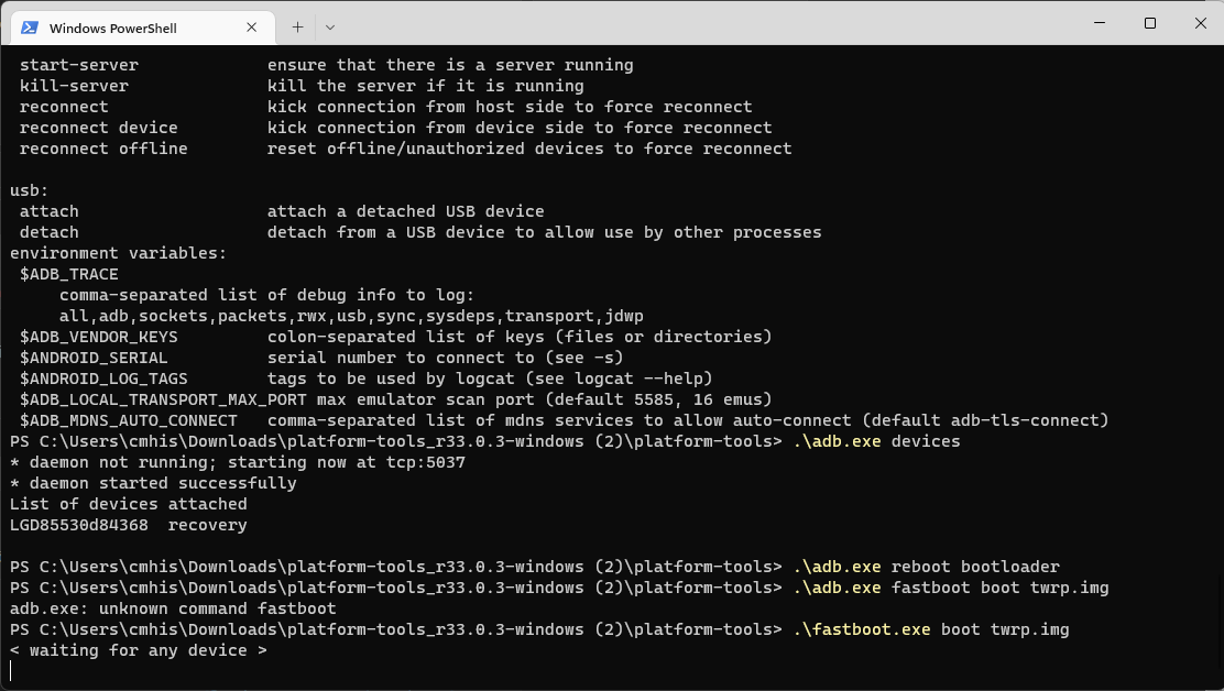 Konuya hızlıca girmek istiyorum. LG G3 telefonumda LineageOS 18.1 kurmuştum, güncellemeleri yaparken Recovery'i de güncellemişim. Telefondan TWRP silindi. Telefonun SD kart girişi bozuk olduğundan daha önceden işlerimi ADB yolu ile halletmiştim ama daha önceden kullandığım toolu bulamadığımdan CMD ile beceremedim.