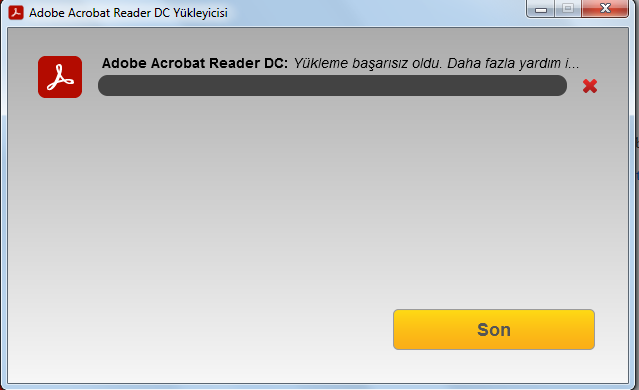 Adobe Reader X kullanıyordum; bugün sabah artık kullanılmıyor, güncelleme gerek gibi bir uyarı geldi. "Güncelleştir"e tıkladım, güncelleme başarısız oldu tarzında bir uyarı geldi, tamama tıkladığımda artık PDF'leri açamadığımı fark ettim. Adobe Reader X'i tekrardan kurmak umuduyla kaldırdım ve internetten çok araştırdım. Installer'ı açtım ama %50'ye geldiğinde "Yükleme başarısız oldu" hatasını aldım.