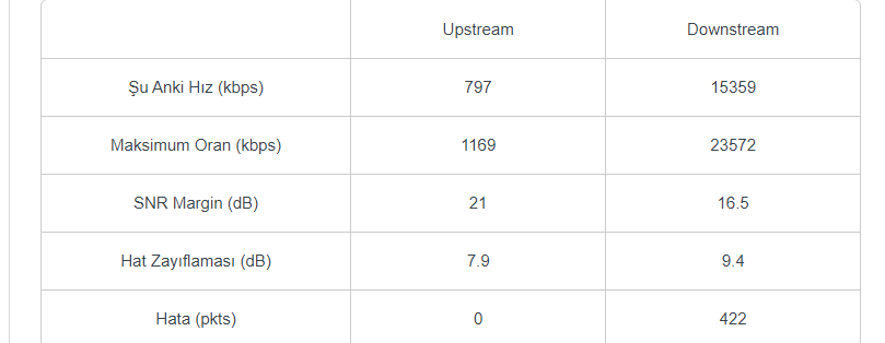 modemi alalı 2 yıl oldu galibaHat değerleriniz gayet güzel gözüküyor fakat Download kısmındaki o hatalar kaç günlük kullanıma ait? Modeminin marka ve modelini yazabilir misin? Ayrıca bu değerler ile VDSL geçmeni tavsiye etmem. Tabi bazen değerler çok şaşırtıcı şekilde değişebiliyor ama önce kullandığın ISS'ye danış VDSL altyapı desteği var ise ve boş port mevcutsa sorunsuz geçebilirsin.