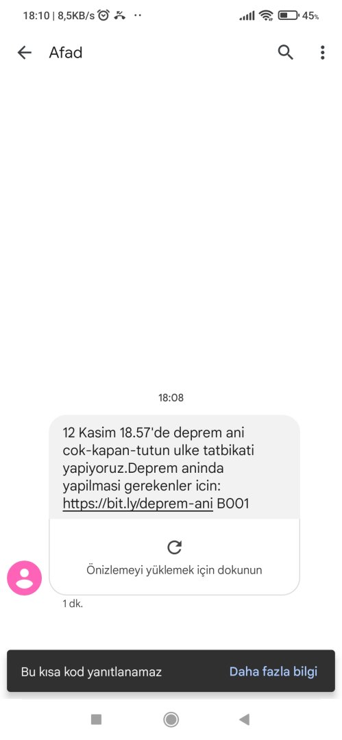 Merhaba telefonuma AFAD ile ilgili mesaj geldi. Mesajda şöyle diyor; 12 Kasım 18:57'de deprem ani icin cok-kapan-tutun ulke tatbikati yapiyoruz. Deprem aninda yapimasi gerekenler icin:https://bit.ly/depremani B001" diye bir şey yazıyor. Bu ne anlama geliyor?