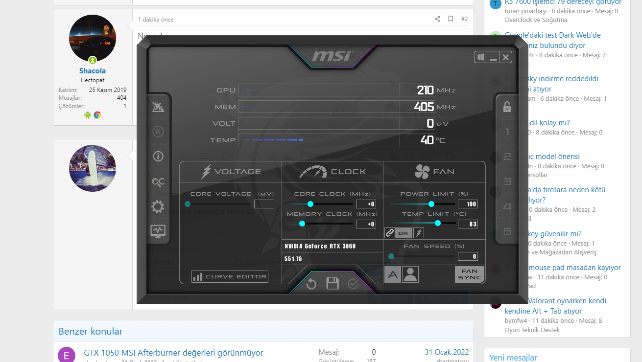 Hocam bakın görseldeki Afterburner değerleri laptopta hiçbir şey açık değilken.