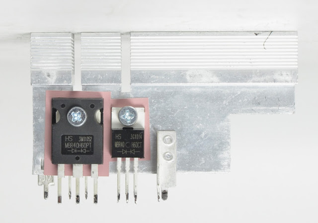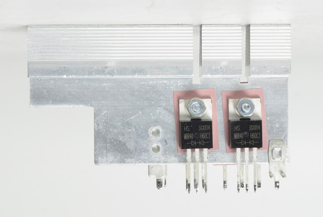 Böylece aynı elektriksel değerlere sahip diyotlar, devredeki görev ve yük koşullarına uygun olarak farklı paket tiplerinde kullanılmış oluyor. Fakat bu PSU için sınırda. Yani uzun ömürlü olduğu söylenemez. (Özellikle ısı yüzünden. Ona geleceğiz.)