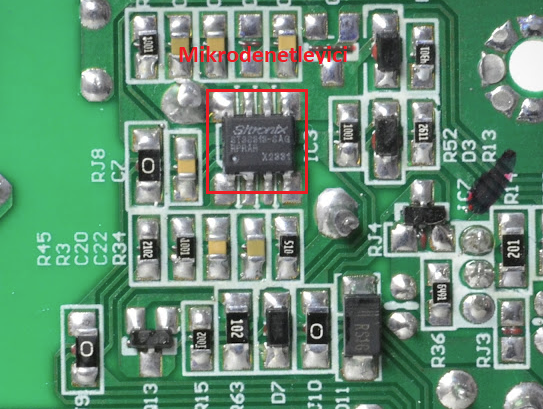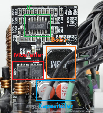 Kırmızı ile işaretlediğim bileşenler, choke bobinleri. İki adet bulunması elbette bir artı.