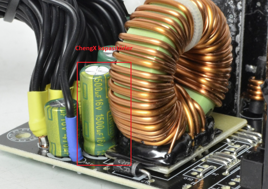 ChengX markalı 105°C çalışma sıcaklığına sahip çıkış filtre kapasitörleri Bulunuyor. Bu marka giriş segementte ürünler üretiyor. Yani uzun ömürlü olmasını pek de beklemeyin. Hatta bu markalı kapasitörler gamebooster gibi markaların PSU larındada var. Örneğin Gamebooster BST-ATX550WEII güç kaynağına bakalım: