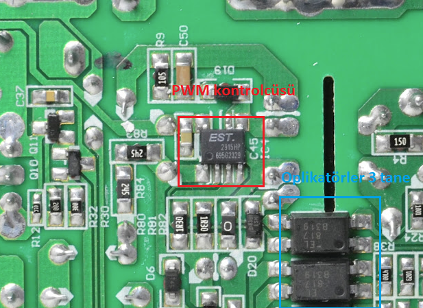 Onun altında ise 3 adet EL817 B319, Optoizolatör Bulunuyor. PSU’daki çıkış voltajının doğru olup olmadığını izliyor. Üreticisi Everlight Electronics Co., Ltd. Bu üretici gayet kaliteli bileşenler üretiyor. Yani oplikatörler gayet güvenilir.