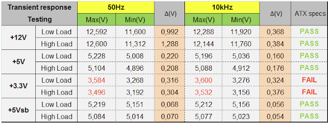 Ripple değerleri beni hayal kırıklığına uğrattı diyebilirim. 12V ve 5V hatları standartlar içinde ve makul seviyede. Ama 3.3V hattındaki 58mV, standart sınırın üzerinde. Bu durum muhtemelen atx 3.0 standartının karşılayamama sebebi.