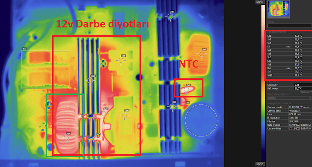 En sıcak nokta NTC çıkmış (direnç işlevi gördüğü için normal). Bir sonraki en sıcak nokta ise 12V hat doğrultucu darbe diyotları ve İleri devre endüktörü alanı.