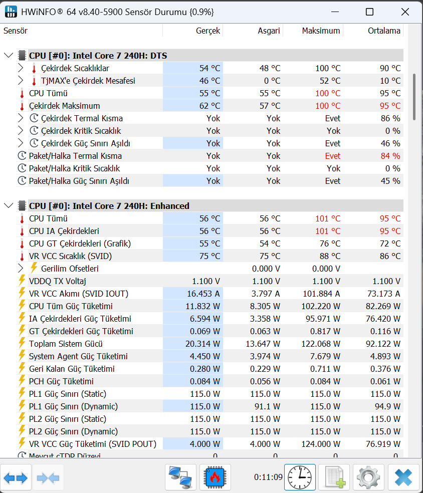 R23 test sonuçları aşağıdaki gibi sizce normal mi (performans modunda testten 30 sn sonra HW Info'yu sıfırladım normalde 115-120 watta kadar çıkmıştı işlemci)?