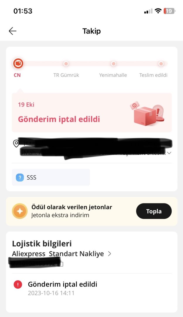 AliExpress'den yaklaşık 20-25 gün önce bir ceket sipariş etmiştim fakat dün 3 gün önce gelen bir kargo takip güncellemesinde gönderim iptal edildi yazıyor. Uygulamada hala gönderimdeymiş gibi gözüküyor ve 60 gün içinde gelmezse iade formu açabilirsin yazıyor. Satıcı ile iletişim kurmak imkansız zaten 15 gün sonra kargoya vermişti mesajlarıma geri dönmüyor görüldü atıyor AliExpress'e mail attım fakat onlarında geri dönüş sağlayacağını sanmıyorum. Bu durumda ne yapabilirim yardımcı olursanız sevinirim.