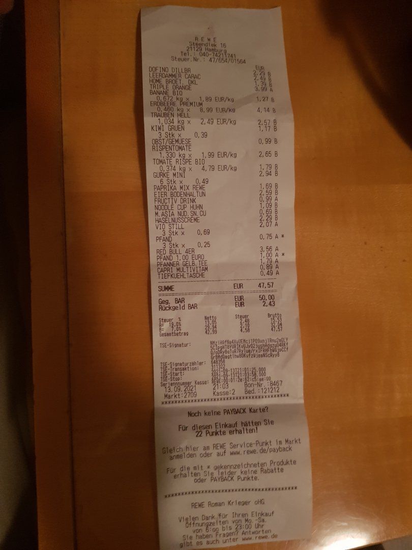 Temel yiyecek dışında Milka, meyve suları, noodle, ejder meyvesi gibi seyler de dahil olmak uzere toplam 47 Euro, ayrica ictigim plastik siseli urunleri geri donusturucuye atip Euro kazanabiliyorum.