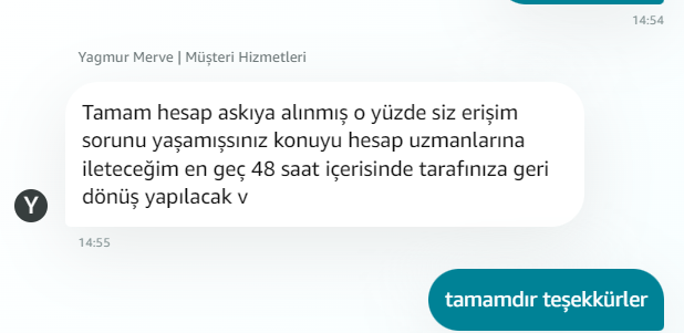 Benim de 2-3 dakika önce hizmetlerin kötüye kullanımı sebebiyle hesabım kapatıldı. Gelen e-postada başka bir hesabımın bulunduğunu söylüyor. Müşteri hizmetlerini arıyoruz ulaşılamıyor diyor, saçmalık. Prime üyeliği ve bir adet siparişim vardı, onlar da gitti sanırım.