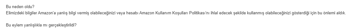 Sabah kalktığımda ise Amazon'dan hesabınız askıya alındı diye mail geldi. Ancak içeriğinde bir bilgi istemiyordu benden.