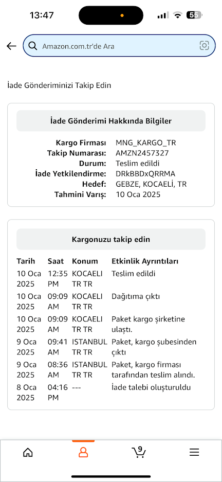9 Ocakta iade ettim. 10 Ocakta Amazon'a teslim oldu.