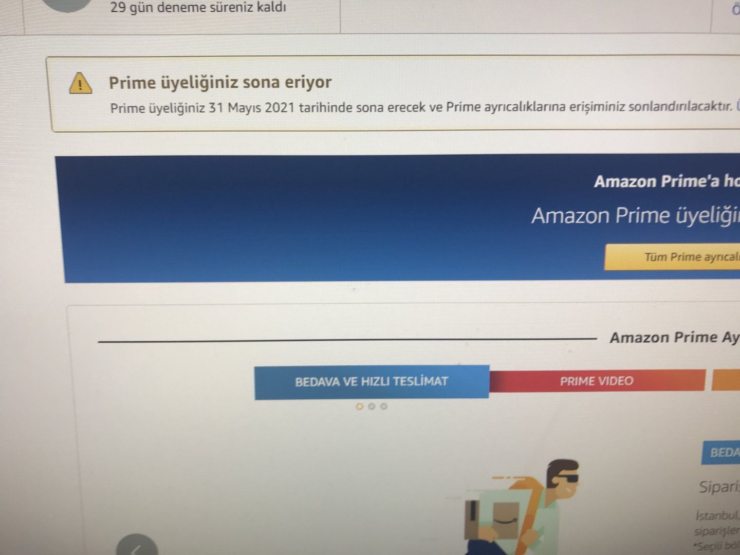 "Prime üyeliğiniz 31 Mayıs 2021 tarihinde sona erecek. Bu tarihte avantajlarınızı kaybedeceksiniz ve kartınızdan tahsilat yapılmayacak."