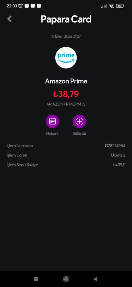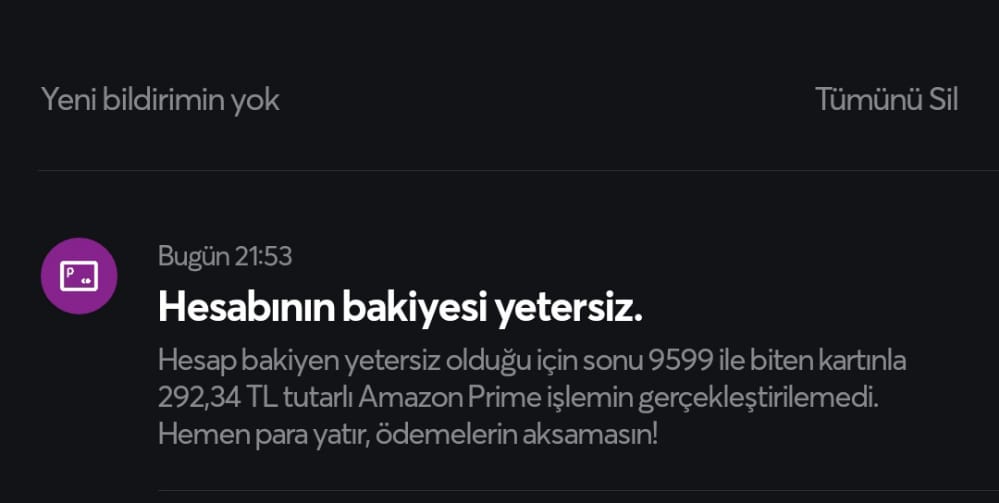 Amazon Prime geçen gün 38.79 TL çekti eyvallah dedim bir yanlışlık olmuştur dedim onun için bir daha iade talebi falan uğraşmak istemedim ama az önce 292 TL Amazon Prime ödeme talimatı verilmiş ve ben vermedim ne olmuş olabilir? Allah'tan hesapta para yoktu kurtardık kapadım kartın işlevini şu anda.