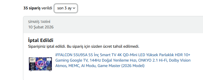 Evet en az 30 kez denememe rağmen sipariş kendiliğinden iptal ediliyor, müşteri hizmetleri 48 saat içerisinde düzelecek dedi fakat düzelen bir şey olmadı. Hayatımda ilk defa Amazon kullandığıma pişman oldum, Prime üyeliğimi de iptal ettirdim. Sanırım Amazon artık yerli mantığıyla çalışmaya başladı.