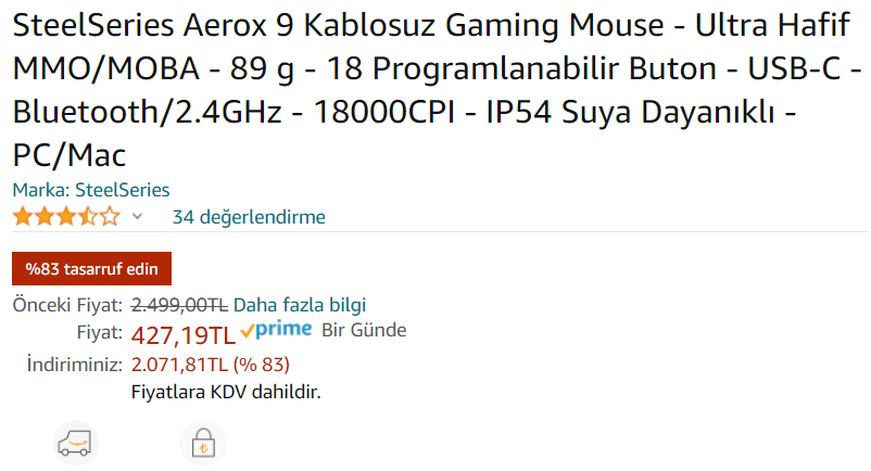 satıcı amazon muydu ?Adamlar SteelSeries Aerox 9 Kablosuz mouse 427 TL'ye sattılar. Piyasa fiyatı 2.000 TL. İnanılmaz. Hemen bitti indirim.Eki Görüntüle 1434166
