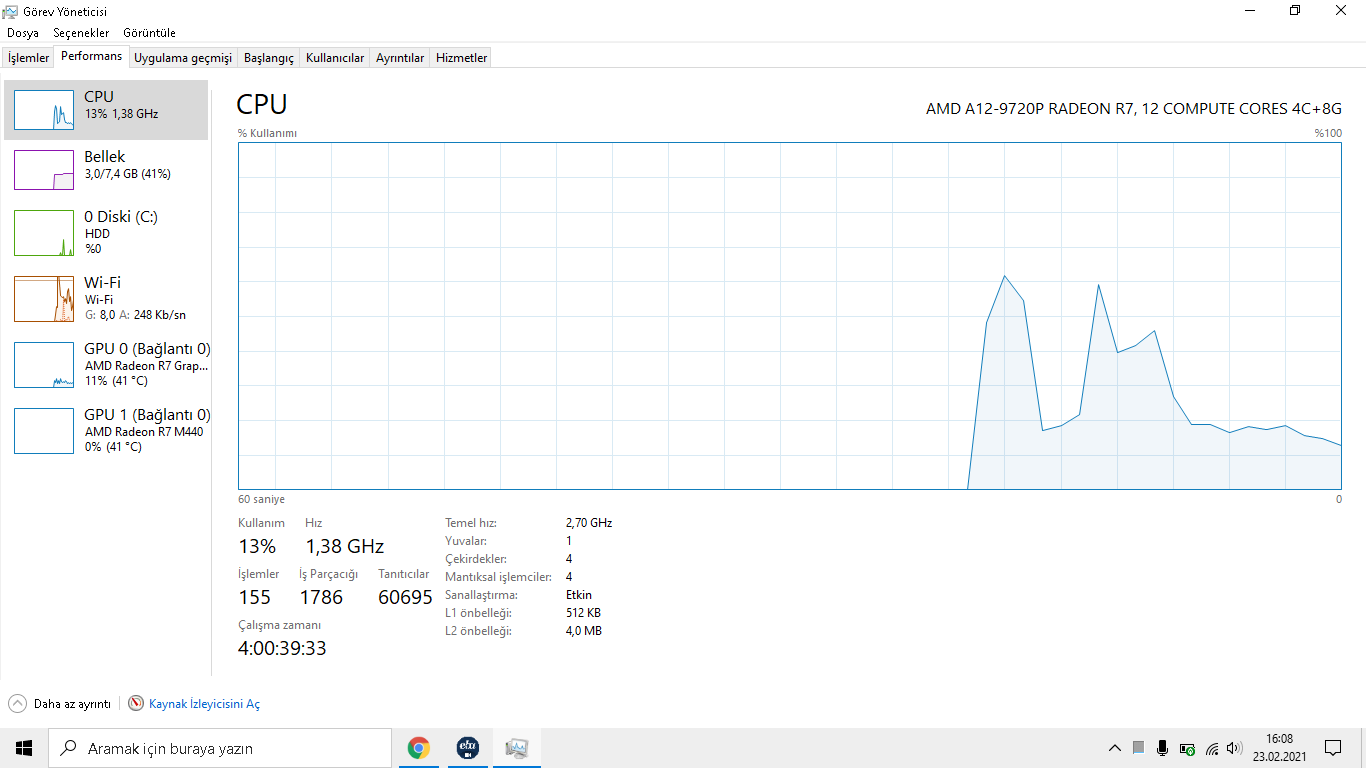 İşlemci: AMD A12-9720p Radeon R7, 12 compute cores 4C+8g 2.70 GHz.