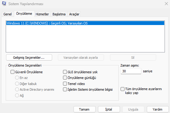 Önyükleme yerine gir ve güvenli önyüklemeye tıkla uygulaya basıp çık. Bu Windows'u güvenli modda açacak.