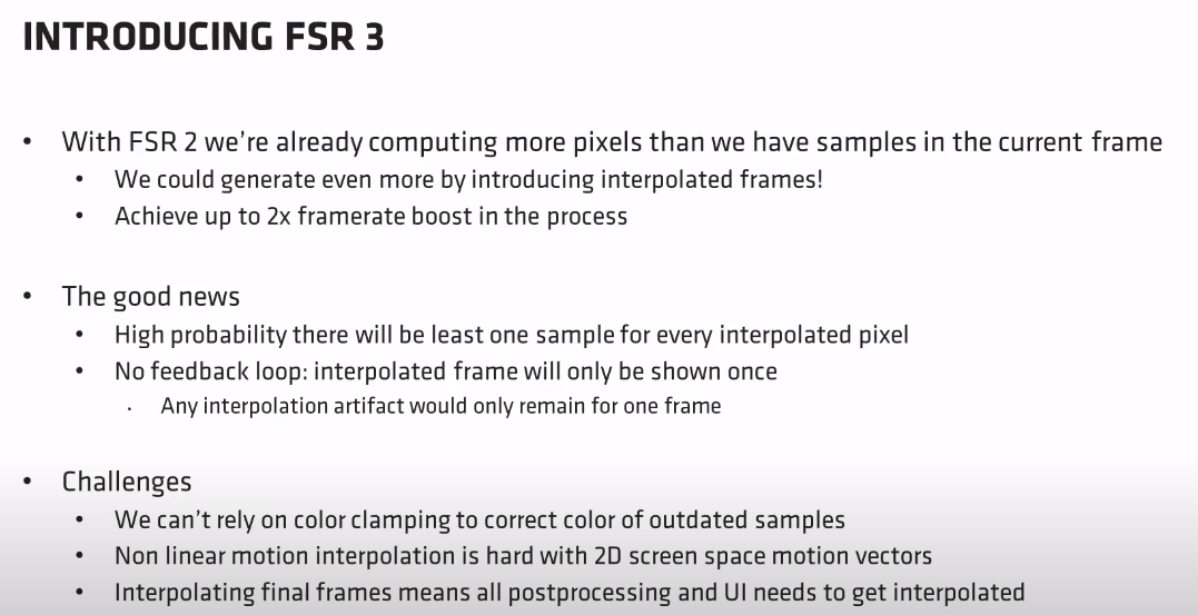 Şu anda FSR 3'ün nasıl olacağını bilmiyoruz. Interpoloration yapay zekaya göre kare oluşturma konusunda o kadar iyi değil. Televizyonda Super Smooth vs. diye görürsünüz. Bazı SVP gibi uygulamalar da aynı tekniği kullanıyor. Oluşturulan kareler resmen hareket eden bir aracı yüksek enstante ile çekiyormuş gibi. Karelerin arasına serpiştirildiği için hareket yüksek FPS'miş gibi hissettiriyor, bulanıklık fark edilmiyor ama bir gariplik her zaman hissediliyor. AMD bunu çözmek için oyun motorundan alınan ek verileri kullanacağız diyor. FSR 1 ve FSR 2'nin nasıl çalıştığına ve olası sorunların nasıl çözüldüğüne dair matematik formüllerini ve algoritmaları da içeren upuzun slaytlar ve belgeler var. Ama FSR 3 için böyle bir veri yok. Sadece HLSL(Yüksek Seviye Gölgelendirici Dili) ile performans odaklı bir optik akış yazılımı yaptık ve bununla interpolation oyundan gelen veriyle üretilecek deniyor. UI elementlerinin(DLSS 3'de var olan bir sorun) eksik çıkmasını da çözdük diyorlar ama başka veri yok.