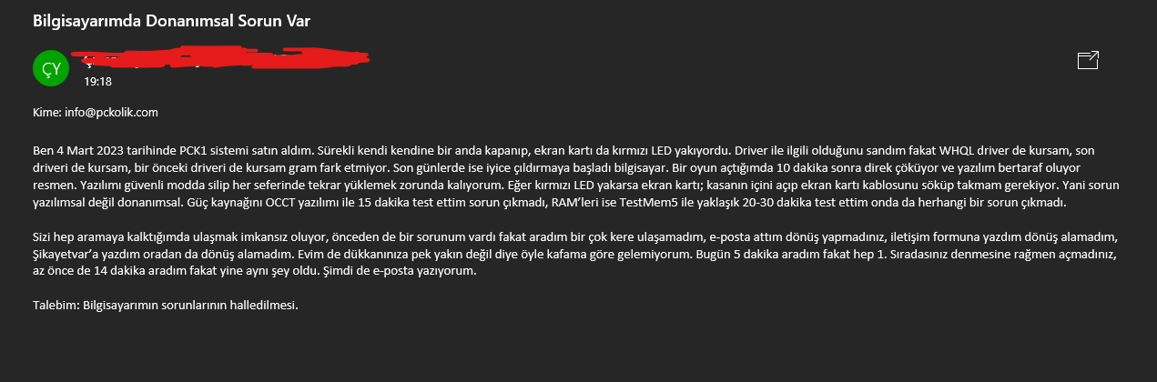 E-posta da yazdım fakat herhangi bir geri dönüş yok şimdiye kadar. 15 Mart'ta attığım e-postaya 14 Nisan'da cevap vermişlerdi. Ayrıca 9 Nisan'da yazdığım Şikayetvar şikayetime hala dönüş yapılmamış.
