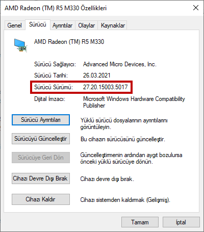 Sorunu çözmek için aygıt yönetici'sini açın. Ardından görüntü bağdaştırıcıları sekmesi altında bulunan ekran kartı sürücünüze sağ tıklayıp özellikler'e tıklayın. Açılan pencerede sürücü sekmesine girip sürücü sürümü'nü kopyalayın, bir kenara not edin.
