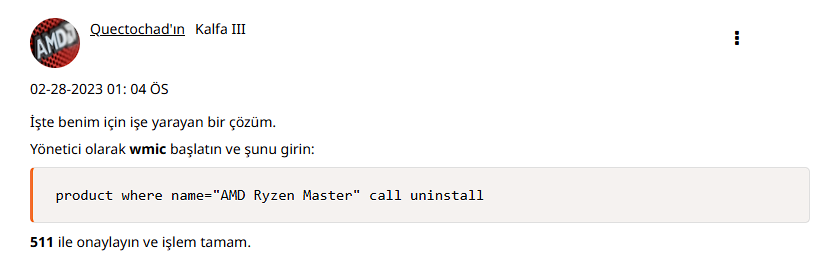 S. A. AMD Ryzen Master SDK adlı program ne yaptıysam silinmedi. En son güvenli kipte girip sildim yine olmadı. PC önceden 2 sn de kapanıyordu şimdi 7-8 saniye sürüyor, Mouse'da da bir tuhaflık var. Revo Uninstaller benzeri çoğu programı denedim, Denetim Masası'ndan da denedim silmeyi olmadı. Var mıdır bilgisi olan? Sırf bunun için format da atılmaz.