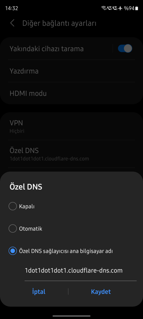 Android'de gizli DNS veya özel DNS adıyla bir DNS ayarı vardır, oradan DNS ayarı yapabiliriz böylece DNS over TLS kullanmış oluruz.