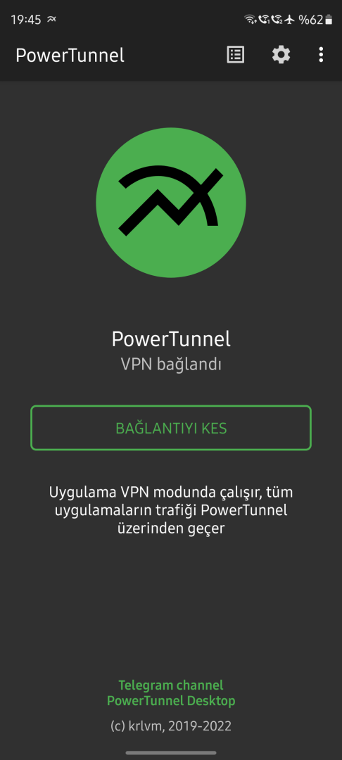 Bundan sonra artık Powertunneli çalıştırabilirsiniz. VPN bağlantısı yapacağını söyler ama bu yerel bir VPN ağıdır, başka sunucuya bağlanmaz, IP değişmez.