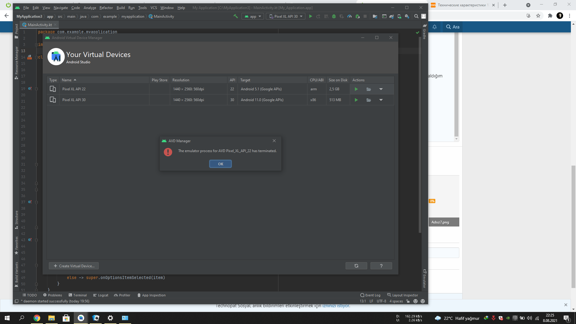 Yazılımda Tools sekmesinden avd Manager'ı açıp yini bir sanal makine oluşturduktan sonra Makine'yi başlatmak için yeşil üçgen simgesine tıkladıktan sonra aldığım hata "the emulator process for avd pixel_xl_apı_22 has terminated." idir.