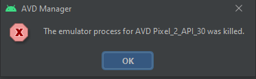 Gradle project sync failed. Basic functionality"The emulator process for avd pixel_3a_api_30_x86 was killed." hatası çözümü