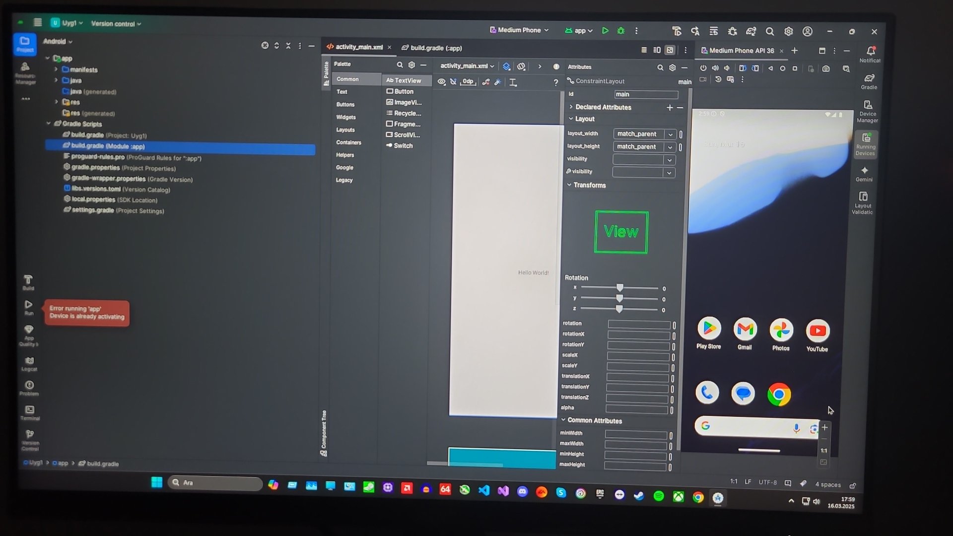 Android Studio emülatör çalısıyor fakat XML kısmı emülatöre gelmiyor, yani hello world yazısı gelmiyor, çözüm aradım fakat bulamadım, hata şu: error running App. yardımcı olursanız sevinirim.