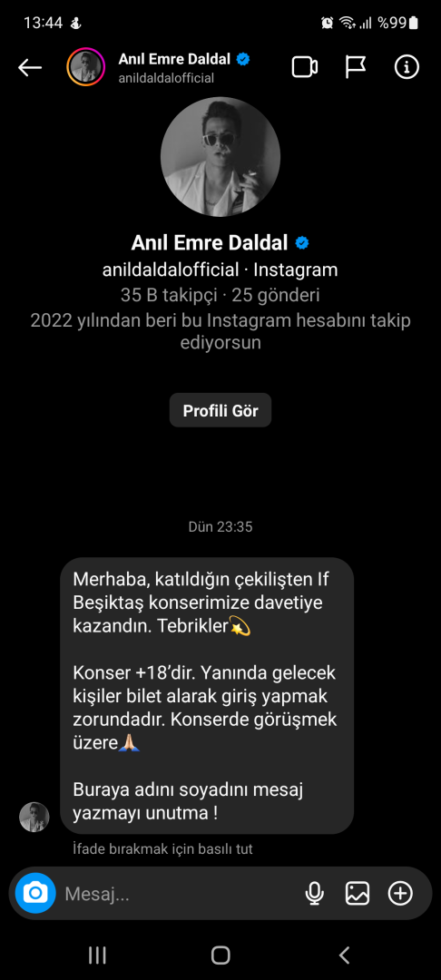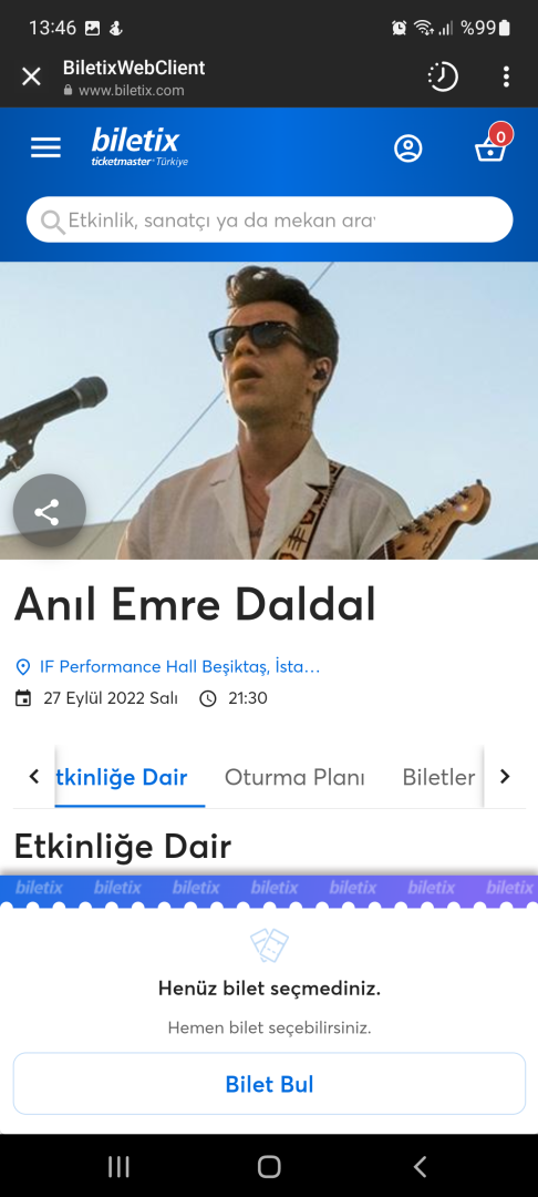 İF Beşiktaş'ta 27 Eylül Pazar tarihinde Anıl Emre Daldal'ın konseri olacak. Ve ben 10 kişiye bilet verilen çekilişi kazandım fakat 18 yaş üstü olduğu için gidemiyorum, bu yüzden satacağım. Papara, Tosla ve Oldubil üzerinden ödeme alabilirim. Fiyatı 80TL düşünüyorum.