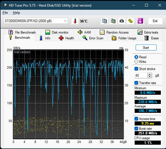 Sorun yaşatan harddiskime Hard Disk Sentinel ve HD Tune Pro kullanarak testlerini yaptım. Bad sector yok, ancak HD Tune Pro'da okuma benchmark testi yüksek başlayıp çok düşüyor. Hatta birkaç kez anlık düşüşler oluyor, bu yüzden mi drop yiyorum? Yanıt olumlu ise ne yapmam gerekiyor?