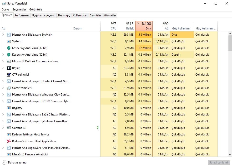Daha sonra görev yöneticisine gireyim dedim ve diskin %100 olarak kullanıldığını fark ettim. Ama ne yaptıysam düzeltemedim.