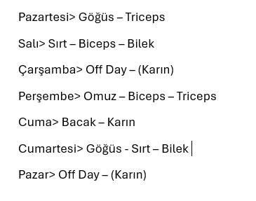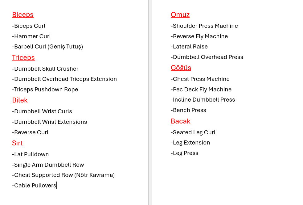 Merhaba arkadaşlar. Fitness'a başlayalı 1 Ay'ı geçti ve programsız gidip rastgele hareketler yapıyordum. İnternette araştırdım ama bulduğum programlar beni tatmin etmedi. Ben de gittiğim yerdeki aletlere ve kendime göre araştırarak bölgesel program hazırladım. Bana önerebileceğiniz şunun yerine şunu yap veya şu bölgeye şunu da ekle dediğiniz şeyler var mıdır? Yoksa hazırladığım program yetirince iyi yapabileceğim bir program mı? Tavsiyelerinizi bekliyorum. Şimdiden teşekkürler.