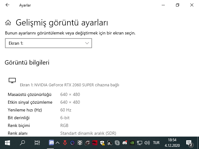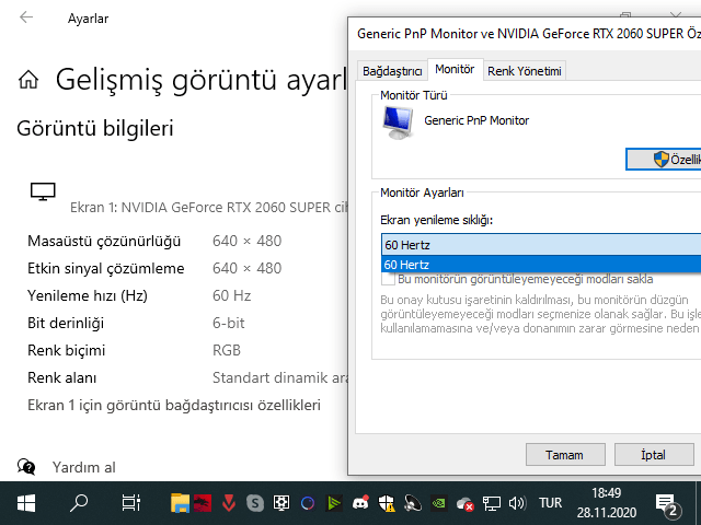 AOC C24G1 144 Hz monitörümü MSI 2060 Super Gaming X ekran kartımda HDMI kablosuyla birlikte 144Hz 1920X1080 olarak sorunsuz kullanıyordum. Ancak HDMI kablosunu çıkartıp DisplayPort girişini bağladığım zaman görüntü 640x480 olarak kalıyor ve ne yaptıysam çözünürlüğü değiştiremedim.