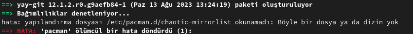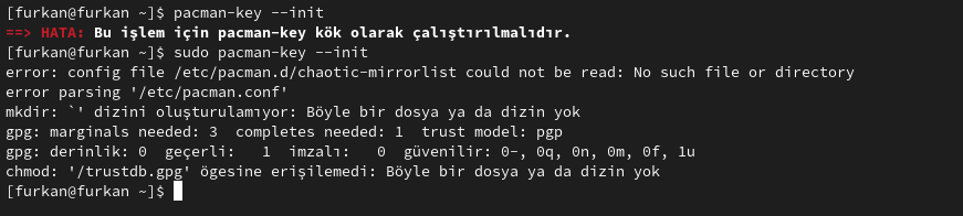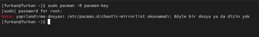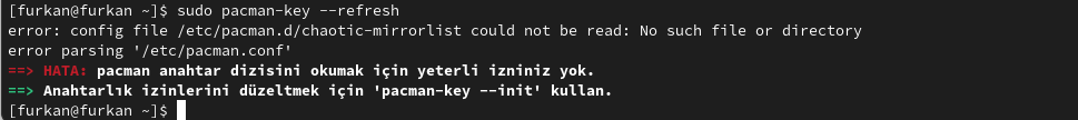 Mirrorlist-1 diye dosya açıp içine Arch Linux sitesinde turkey serverlarını koydum. Conf dosyasından değiştirdim. Sonuna da chaotic include yaptım.
