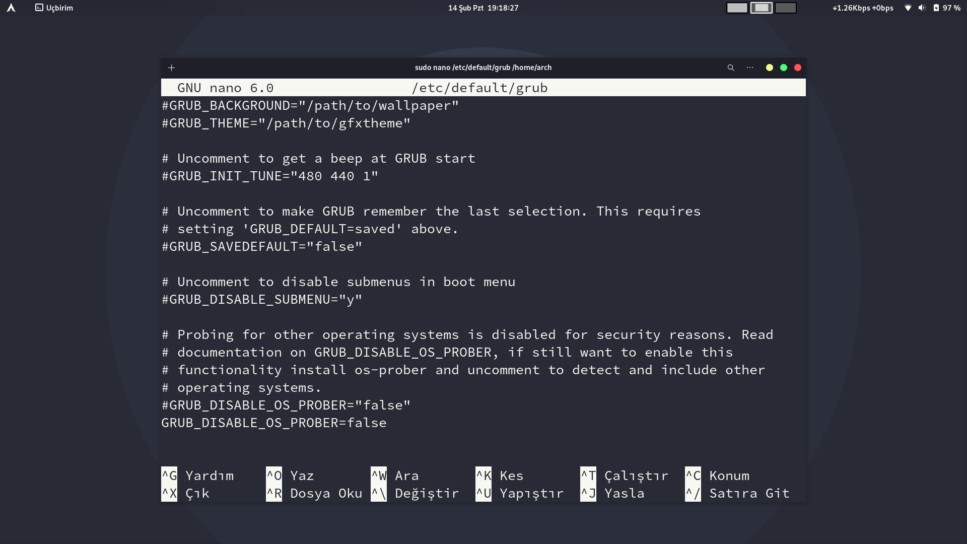 Anladim, simdi son satirda bi' hata yaptim. Oraya gel ve false yazan kismi tirnak icine al, GRUB_DISABLE_OS_PROBER="false" olarak gozukmeli son satir. Sonra Ctrl + W yap kaydedecek. Sonra Ctrl + X basip cik.