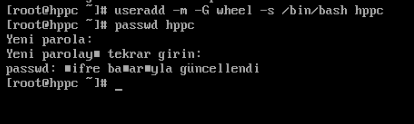 useradd -m -G wheel -s /bin/bash hppcSondaki hppc kullanıcı adıdır. Siz dilersenz başka bir isim verebilirsiniz.