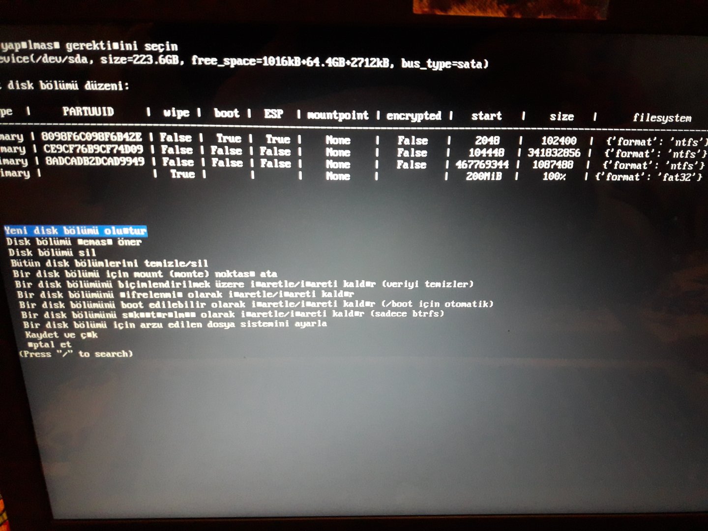 O seçeneğe basın ve boot bölümünüzü seçin. FAT32 olarak oluşturduğunuz 250-500MB'lık bölüm yani.
