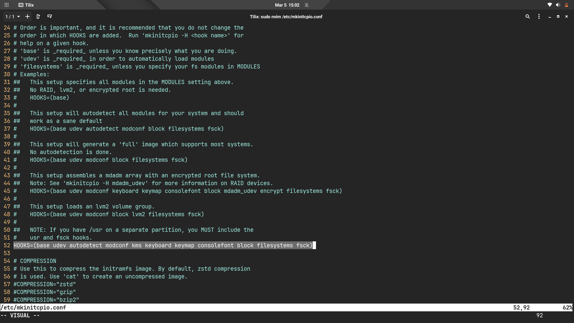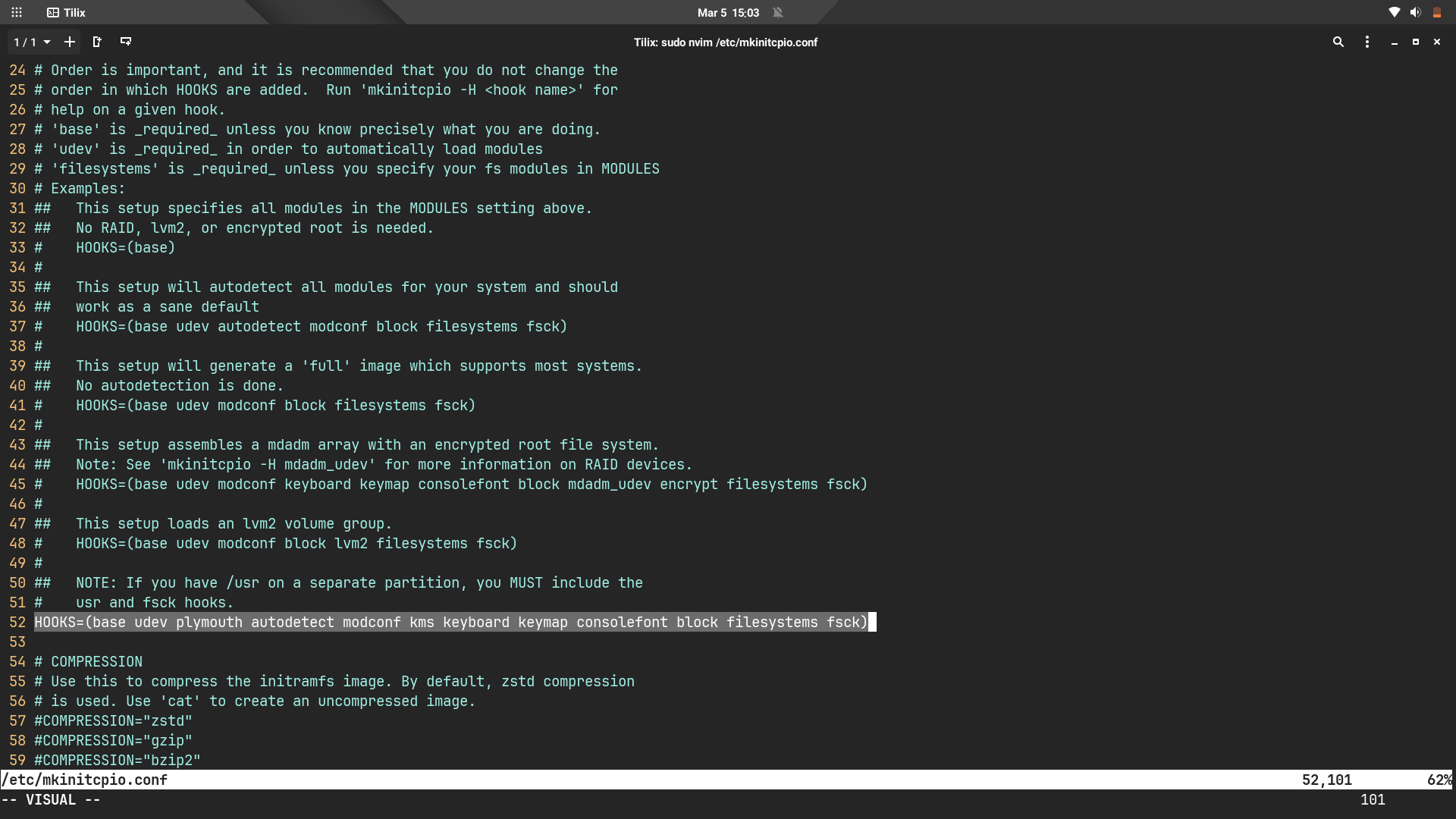 Gördüğünüz gibi satırımız artık HOOKS=(base udev plymouth...) şeklinde gidiyor.